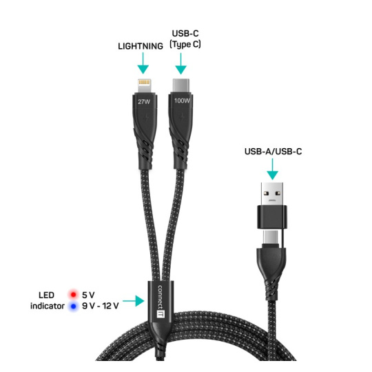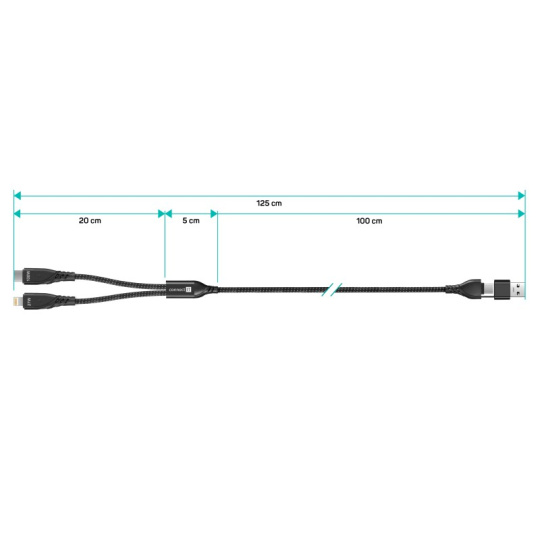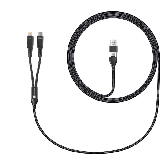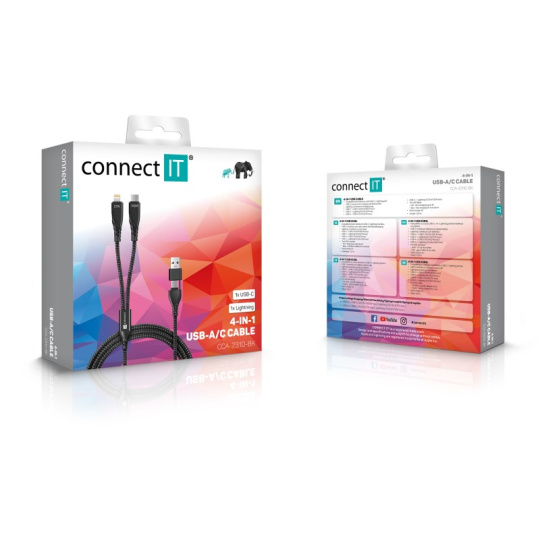 Univerzálny nabíjací kábel 4v1 na nabíjanie zariadení s konektormi 1x USB-C a 1x Lightning so vstupným konektorom USB-C a redukciou na USB-A. Umožňuje nabíjať až dve zariadenia súčasne s podporou rýchleho nabíjania pomocou max. prúdového toku 5 A. Špeciálna manžetová nadstavba konektorov zabezpečuje lepšiu prístupnosť k nabíjacím zásuvkám mobilných telefónov v púzdrach.