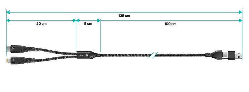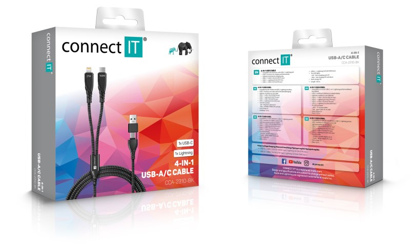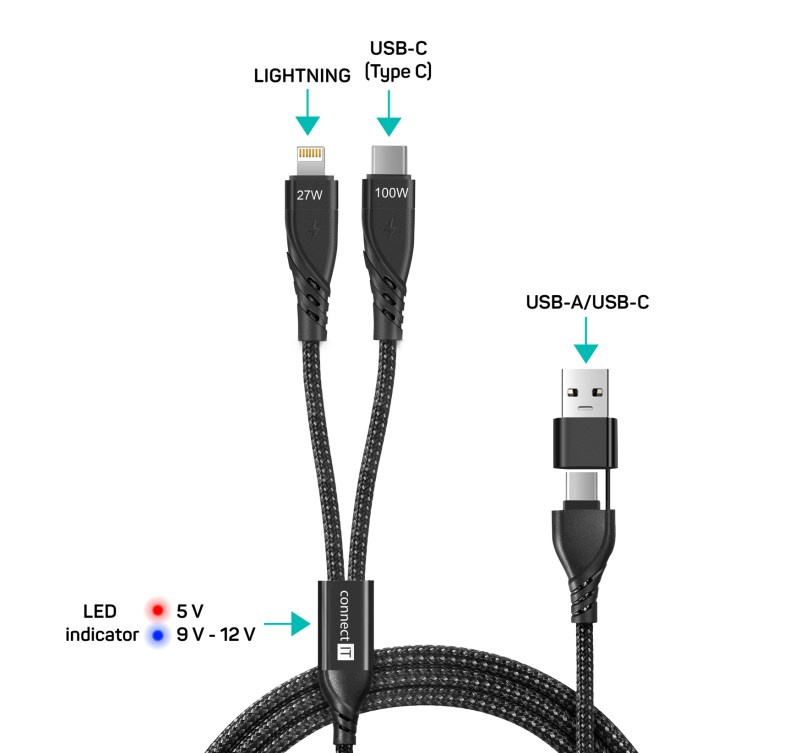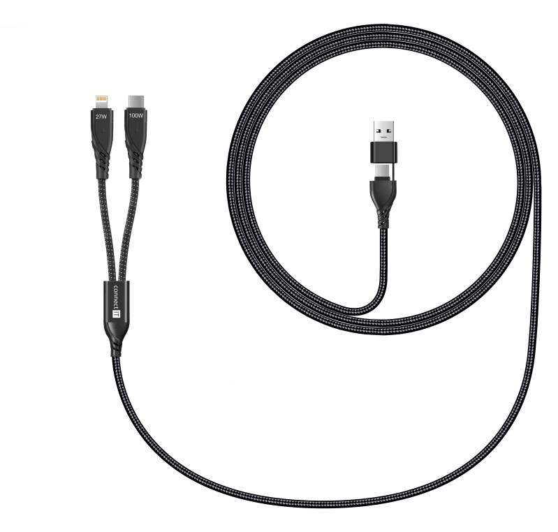 Univerzálny nabíjací kábel 4v1 na nabíjanie zariadení s konektormi 1x USB-C a 1x Lightning so vstupným konektorom USB-C a redukciou na USB-A. Umožňuje nabíjať až dve zariadenia súčasne s podporou rýchleho nabíjania pomocou max. prúdového toku 5 A. Špeciálna manžetová nadstavba konektorov zabezpečuje lepšiu prístupnosť k nabíjacím zásuvkám mobilných telefónov v púzdrach.
