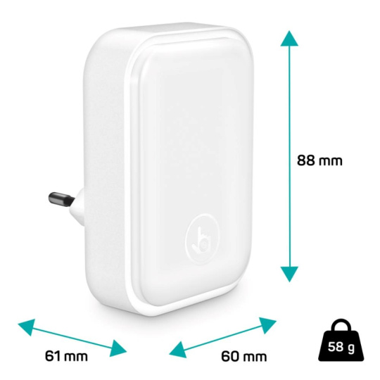 Světlo disponuje touch tlačítkem, které umožňuje zapnout/vypnout světlo a nastavit jas světla ve 3 úrovních. Světlo stačí jednoduše zapojit do libovolné zásuvky a při příkonu 0,65 W se nemusíte bát spotřeby elektrické energie. LED zdroj světla disponuje světelným tokem 30 lumenů.