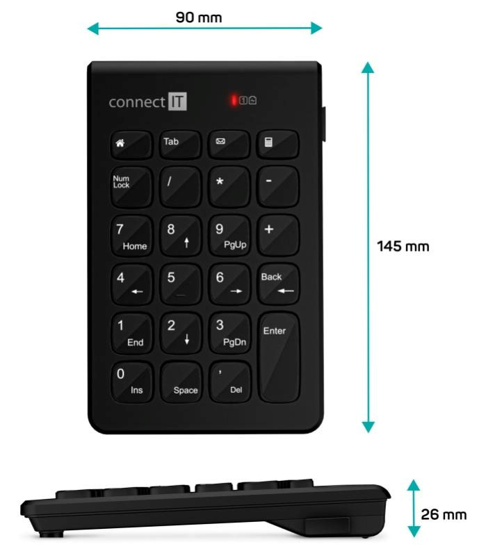 Klávesnica slúži ako prídavná klávesnica na výpočty. Uplatní sa najmä u notebookov, ktoré nemajú samostatnú numerickú časť a čísla je potrebné zadať dvojstlačením klávesov cez Shift klávesu. Výborne poslúži aj v prípade, keď potrebujete mať klávesnicu na druhej strane a ovládať ju ľavou rukou. Rovnako ju môžete mať vďaka bezdrôtovému pripojeniu priamo na zošite so zdrojovými dátami a zadávať tak výpočty pohodlne mimo počítača alebo notebooku. Ideálne pre všetkých, ktorí pracujú s účtovníctvom, tabuľkami, výpočtovými a finančnými aplikáciami.