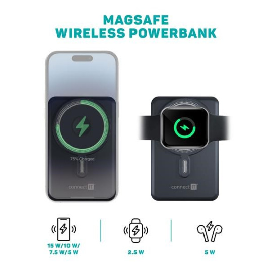 Bezdrôtová MagSafe powerbanka s kapacitou 10000 mAh kompatibilná s Apple iPhone a Apple Watch. Disponuje integrovaným USB-C a Lightning káblom. Podporuje až 20 W rýchlonabíjanie pomocou USB-C kábla.