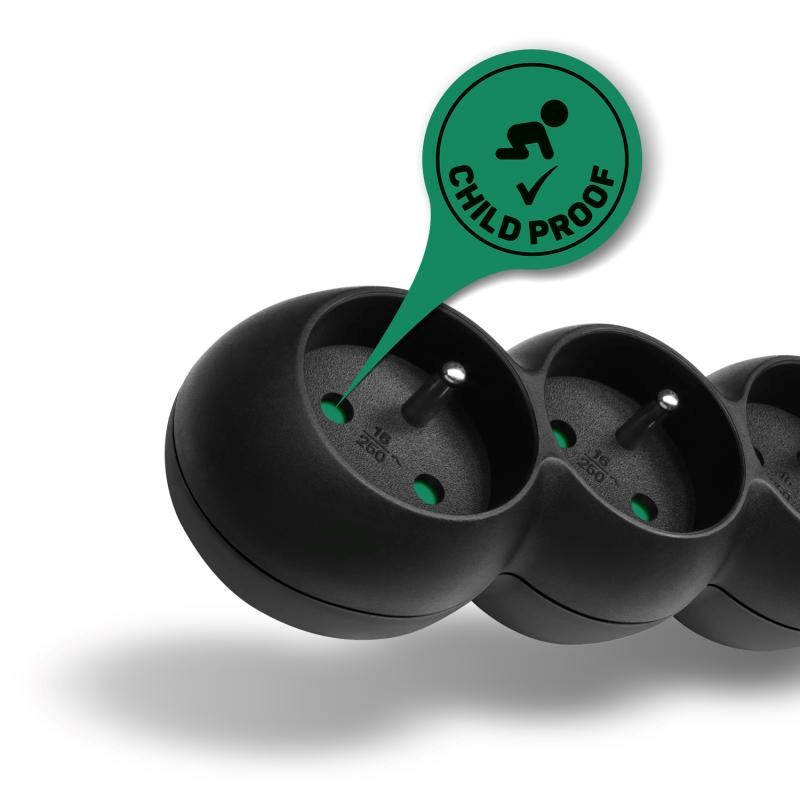 Prodlužovací káblový prívod na 230V je vybavený hlavným sieťovým vypínačom, ktorý pri vypnutí úplne odpojí od prívodu elektrickej energie všetky zapojené spotrebiče naraz. Extra výbavou je detská ochrana všetkých zásuviek – zásuvky sú prístupné iba v prípade zasunutia oboch vidlíc naraz, teda nie je možné zasunúť jednotlivé napr. šroubovák alebo pletaciu ihlicu. Vďaka otočeniu zásuviek o 45° je možné používať aj objemnejšie napájacie adaptéry alebo uhlové koncovky. Výsuvné očko v hornej časti zásuvkového modulu umožňuje zavesenie alebo pevné inštalovanie na stenu (s výhodou využijete napr. v dielňach a garážach). Výrobok bol testovaný a certifikovaný v európskom testovacom centre a spĺňa najprísnejšie bezpečnostné požiadavky a najnovšie normy, takže umožňuje zapojenie spotrebičov o celkovom príkonu až 2300 W.