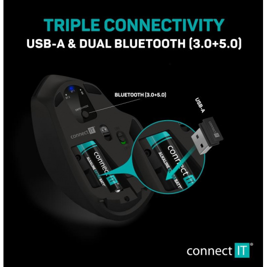 Kancelárska tichá bezdrôtová myš s tromi bezdrôtovými profilmi podporujúcimi štandardy Bluetooth 5.0, 3.0 a Wirelless 2,4 GHz vybavené 2 tichými tlačidlami MuteButt, rolovacím kolieskom a tlačidlom na prepínanie bezdrôtového režimu. Unikátna technológia Triple SmartSwitch umožňuje používať myš až na troch zariadeniach, ktoré podporujú Bluetooth 5.0, 3.0 alebo majú vstup USB-A. Táto funkcia je ideálna na profesionálne a domáce použitie všade tam, kde potrebujete pracovať s jednou myšou na viacerých počítačoch alebo notebookoch. Ľavé a pravé tlačidlo myši sú vybavené technológiou SilentClick s tichou prevádzkou, ktorá pri kliknutí nevydáva žiadny zvuk. Samozrejme, pod krytom priestoru pre batériu sa nachádza integrovaný úložný priestor pre prijímač USB Nano. Súčasťou balenia je originálna alkalická tužková batéria CONNECT IT.