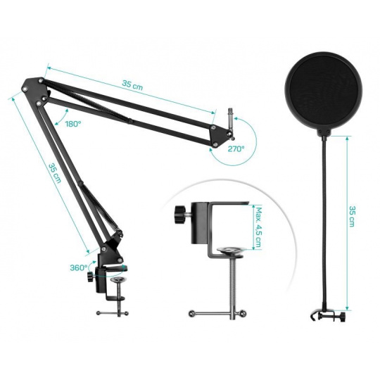 - Teleskopické rameno s pružinovým mechanizmom a tromi kĺbmi na jednoduché nastavenie výšky a uhla mikrofónu