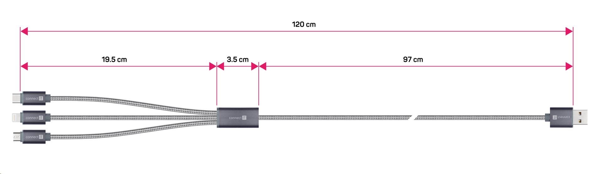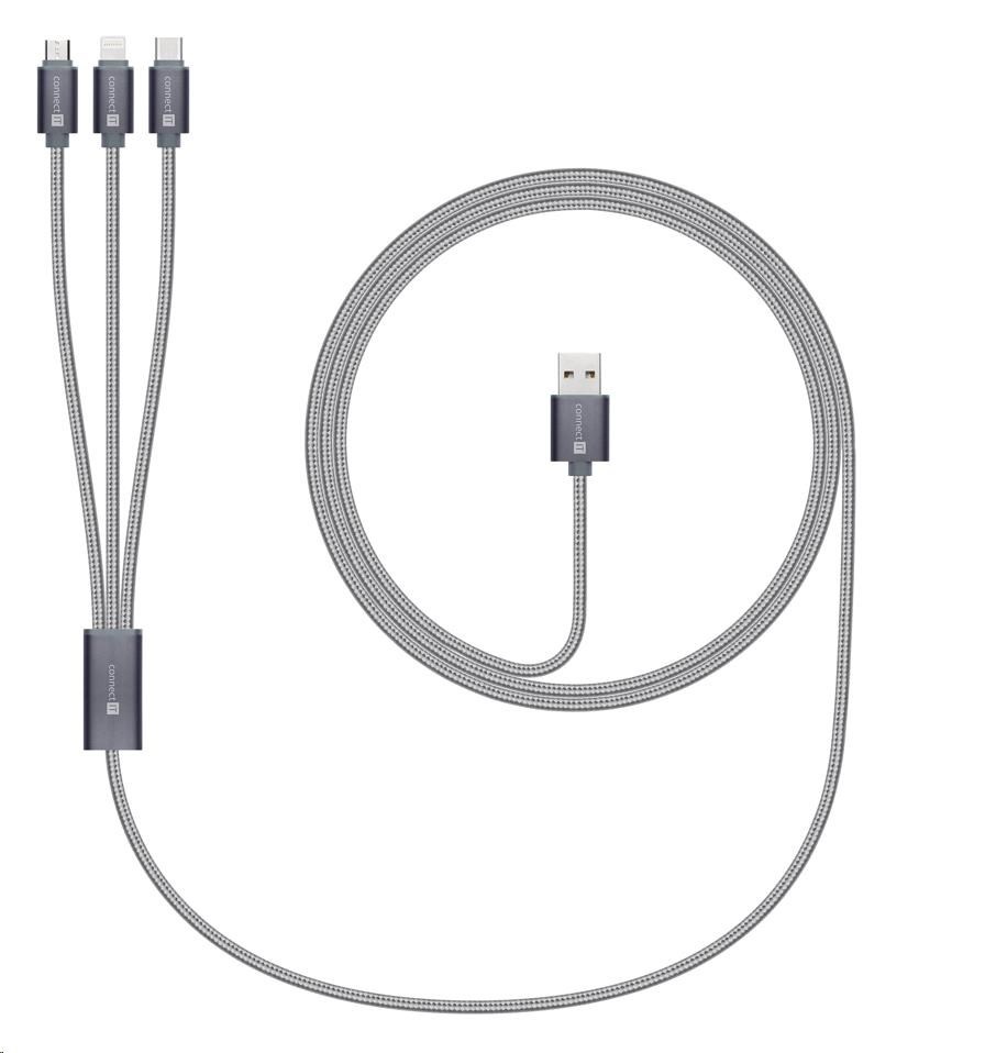 CONNECT IT Wirez 3v1 USB-C & Micro USB & Lightning, strieborná sivá, 1,2 m