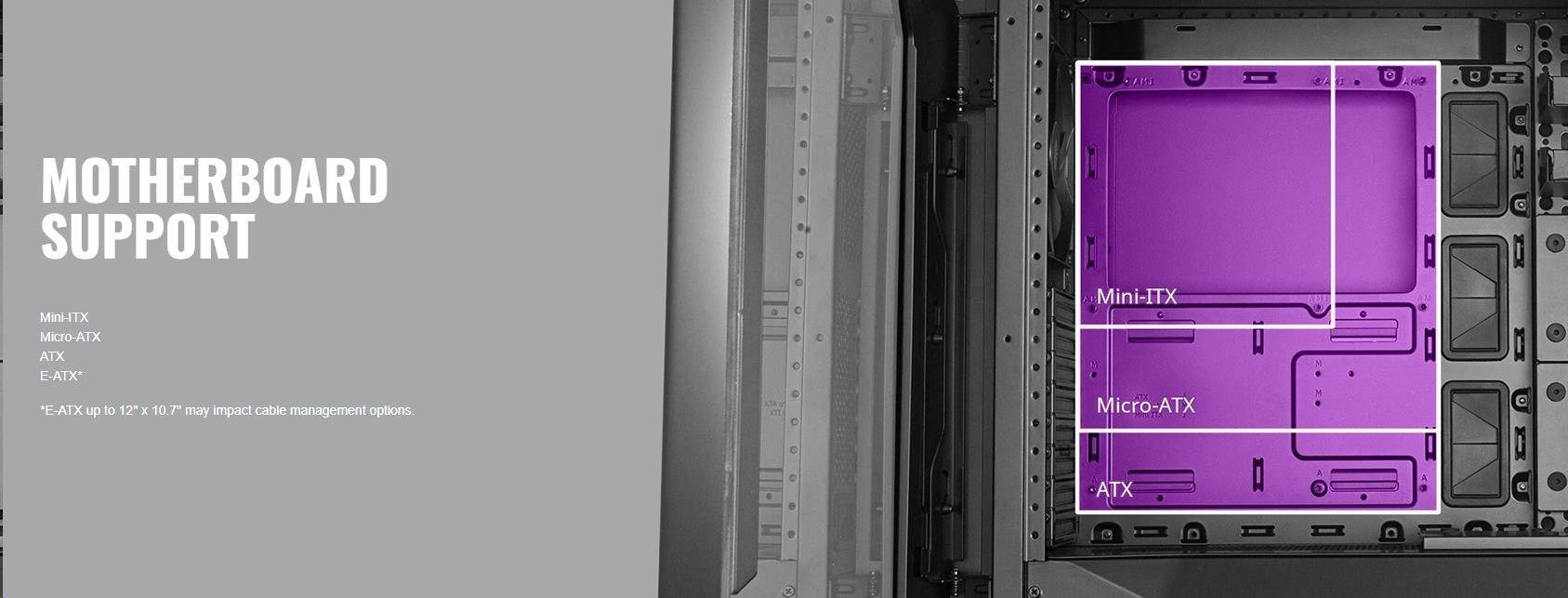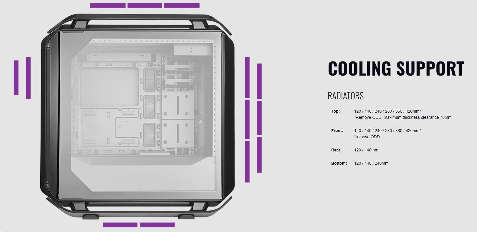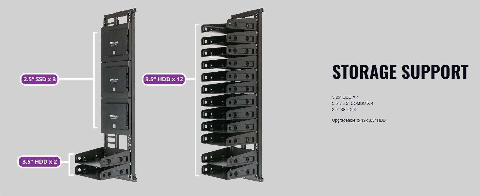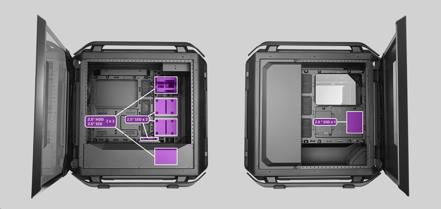 Kryt PSU je modulárny vďaka dvom nezávislým dielom, zatiaľ čo systém krytu káblov obsahuje 3 samostatné diely, z ktorých každý umožňuje montáž úložiska alebo čerpadla pre kapalinové chladenie.