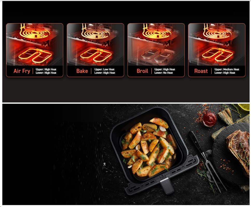 Nechajte fritézu robiť prácu za vás pomocou funkcií varenia jedným dotykom, ako je teplovzdušné vyprážanie, pečenie, grilovanie, pečenie, ohrievanie, kuracie mäso, steak, morské plody, zelenina, hranolky, mrazené a udržiavanie teplého jedla. Preskúmajte ďalšie možnosti prispôsobením vlastných funkcií varenia podľa preferovaného času a teploty.