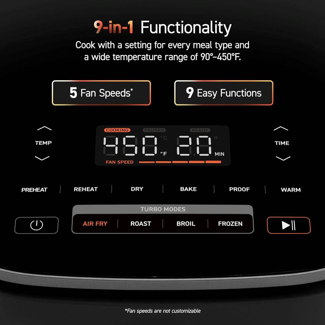 Cosori TurboBlaze ponúka rôzne možnosti predprogramovanej prípravy jedál, ako fritovanie, pečenie mäsa, pečenie sladkých výrobkov, grilovanie, sušenie ovocia alebo zeleniny, príprava mrazených potravín, ohrievanie, kysnutie, predhrievanie a udržiavanie teploty a tieto nastavenia je možné ďalej upraviť podľa vašich preferencií