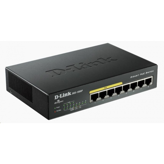 D-Link DGS-1008P 8-portový gigabitový stolový prepínač, 4 porty PoE+, rozpočet PoE 68 W