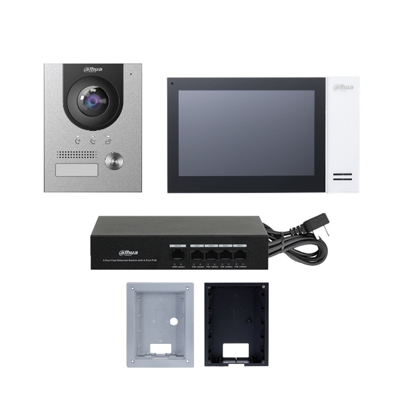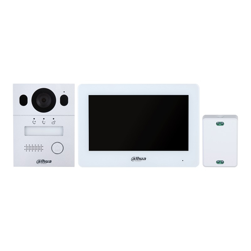 Dahua analogová sada 4-wire, biely monitor VTH1020J, 7" farebný LCD displej s rozlíšením 1024 x 600 px, dotykové tlačidlá, rozmery 182 x 134 x 17 mm, dverná jednotka VTO1000J, biely plast, 1 mechanické tlačidlo, kamera 1,3 Mpx CMOS, uhol záberu 70°, 1x ovládanie zámku, IP 65, rozmery 132 x 46 x 34 mm, systémové napájanie externým zdrojom zapojeným do monitora (zdroj je súčasťou balenia), podpora analog kamier, balenie obsahuje konektory na pripojenie jednotiek, montážne prvky