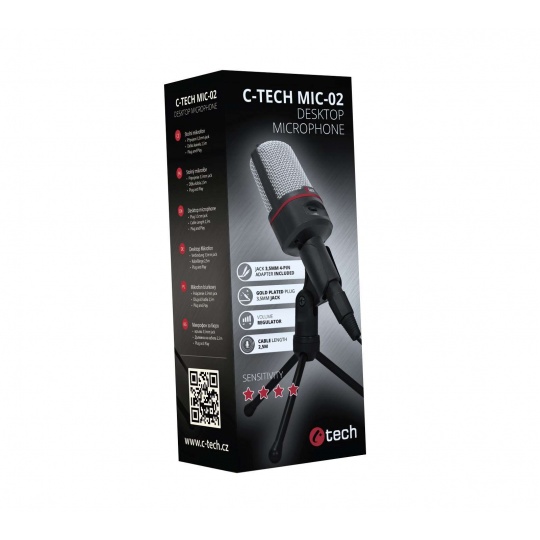 C-TECH MIC-02 je vysokokvalitný mikrofón s prirodzenou kvalitou reprodukcie hlasu na každodenné použitie. Je vhodný na používanie s komunikačnými programami, ako aj na vytváranie videí na YouTube alebo živých prenosov. Mikrofón sa pripája pomocou 2,5 m kábla s pozláteným 3,5 mm stereo jack konektorom, ale súčasťou balenia je aj stereo redukcia 3-pin/4-pin jack na pripojenie mikrofónu k zariadeniu, ktoré má kombinovaný zvukový konektor pre mikrofón a slúchadlá. Mikrofón je vybavený spínacím tlačidlom s ovládaním hlasitosti. V balení nájdete praktický statív, vďaka ktorému môžete mikrofón umiestniť do rôznych polôh.
