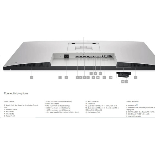 1. Slot na zámok (základ na Kensington Security Slot™) 2. Napájací konektor 3. HDMI port 1 4. HDMI port 2 5. DisplayPort 1 6. DisplayPort 2 7. USB-C upstream port 1 (Video + Data) 8. Výstup pre audio line-out 9. USB-C upstream port 2 (iba dáta) 10. USB-C upstream port 3 (iba dáta) 11. USB-C upstream port 4 (iba dáta) 12. 3 x SuperSpeed USB-A 10Gbps (USB 3.2 Gen 2) 13. RJ45 konektor 14. Zámok stojanu 15. Rýchly prístup USB port 1 - USB-C dátový port 16. Rýchly prístup USB port 2 - SuperSpeed USB-A 10Gbps (USB 3.2 Gen 2) 17. 2 x reproduktory (8W) |