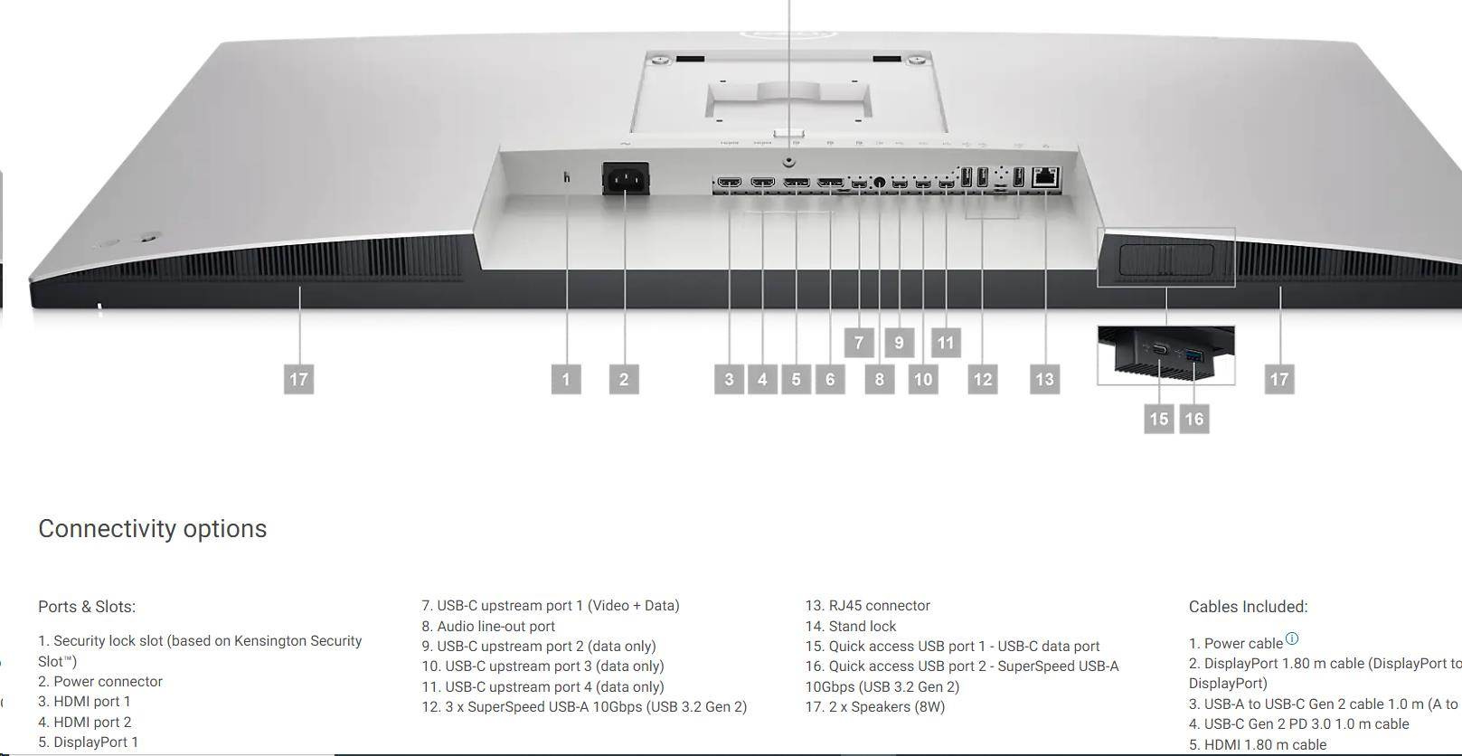 1. Slot na zámok (základ na Kensington Security Slot™) 2. Napájací konektor 3. HDMI port 1 4. HDMI port 2 5. DisplayPort 1 6. DisplayPort 2 7. USB-C upstream port 1 (Video + Data) 8. Výstup pre audio line-out 9. USB-C upstream port 2 (iba dáta) 10. USB-C upstream port 3 (iba dáta) 11. USB-C upstream port 4 (iba dáta) 12. 3 x SuperSpeed USB-A 10Gbps (USB 3.2 Gen 2) 13. RJ45 konektor 14. Zámok stojanu 15. Rýchly prístup USB port 1 - USB-C dátový port 16. Rýchly prístup USB port 2 - SuperSpeed USB-A 10Gbps (USB 3.2 Gen 2) 17. 2 x reproduktory (8W) |