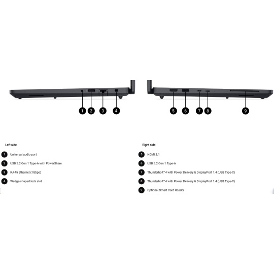 | 4 cell, 72Whr, ExpressCharge™ Capable, standard battery, 130W AC adapter, USB Type C |