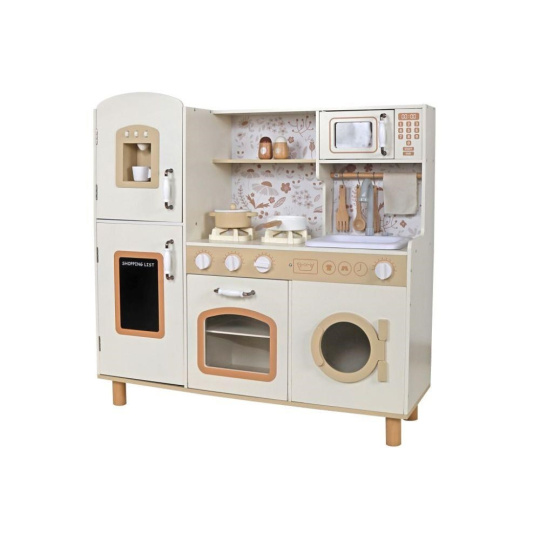 Detská kuchynka v svetlých farebných tónoch, ozdobená kvetmi, je štýlovou edukatívnou hračkou pre deti od 3 rokov veku. V drevenej kuchynke s modernými spotrebičmi a tečúcou vodou si deti uvoľnia svoju fantáziu, môžu variť, piecť a zohrievať jedlá, variť kávu a pokojne vyprať špinavé bielizeň. Jednoducho si vyskúšajú dospelácke činnosti bezpečným detským spôsobom. Reálny nádych celej hre dodajú zvukové efekty, ktoré vydáva sporák alebo vodovodná batéria.