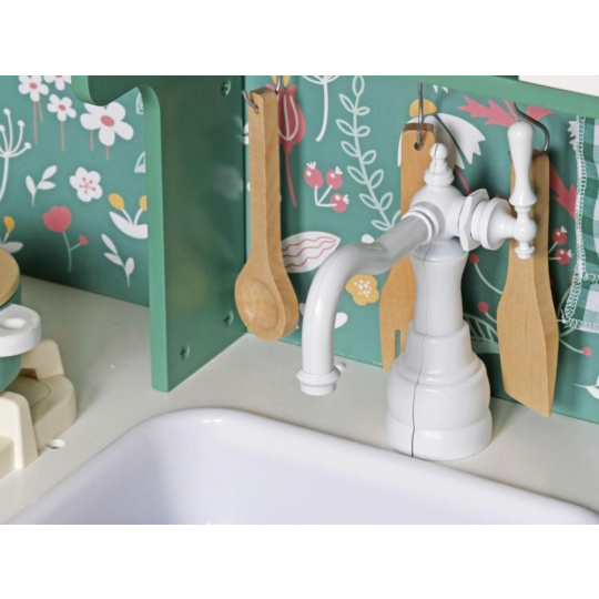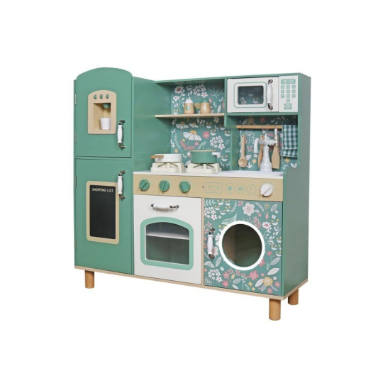 Detská kuchynka v krásnych farbách, s kvetinovým vzorom, je štýlovou edukačnou hračkou pre deti od 3 rokov veku. V drevenej kuchynke s modernými spotrebičmi deti vypustia uzdu svojej fantázii, môžu pripravovať jedlá, uvariť kávu a pokojne vyprať špinavé prádlo. Jednoducho si vyskúšať dospelácke činnosti bezpečným detským spôsobom. Reálny nádych celej hre dodá sporák so svetelnými a zvukovými efektmi.