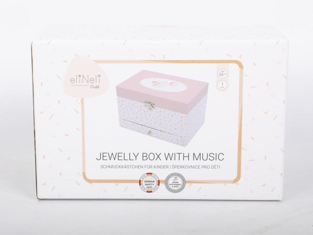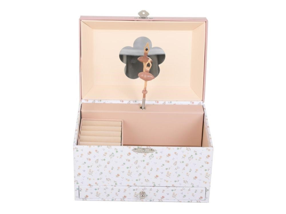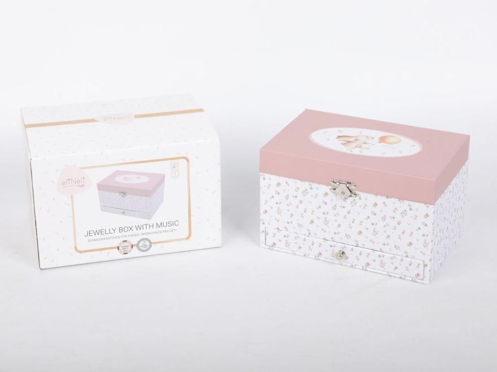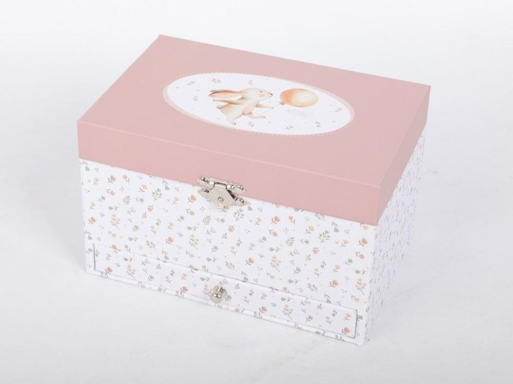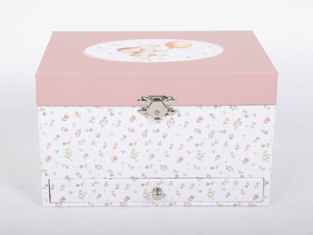 Detská šperkovnica zdobená drobnými kvetmi, s roztomilým zajíčkom na veku, očarí každú malú parádivku. Šperkovnica pre deti, s členitým vnútorným priestorom a praktickou zásuvkou v spodnej časti, ponúka dostatok miesta na uloženie prsteňov, dievčenských šperkov, drobných pokladov. Uvnútri šperkovnice sa ukrýva nielen zrkadlo, ale aj nežná baletka, ktorá vašej dcérke rada zatancuje.