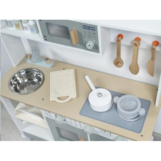Štýlová drevená detská kuchynka umožní malým kuchárkam a kuchárom vrhnúť sa do varenia a pečenia, prípravy pokrmov a do kuchynských prác priamo vo svojej vlastnej kuchyni. V drevenej kuchynke v krásnom neutrálom farebnom prevedení môžu deti vypustiť uzdu svojej fantázii a premeniť sa na skutočných kulinárskych majstrov. K ruke im budú zabudované spotrebiče aj riad, s ktorým pôjde varenie aj pečenie ako po masle. V kuchynke nechýba pečiaca rúra, mikrovlnná rúra, sporák so 2 platňami, drez na špinavé riady ani hodiny. Pre prípravu chutných pokrmov je detská kuchynka dovybavená rôznymi koreninami. Táto edukatívna hračka umožní deťom vyskúšať si dospelácke činnosti bezpečným detským spôsobom. K náteru sa používajú vodou riediteľné farby, vhodné a bezpečné pre deti. Vďaka pridavným (nasadzovacím) nohám porastie kuchynka s vaším dieťaťom, po pridaní nôh sa celá (teda aj pracovná doska) zdvihne o 6 cm.