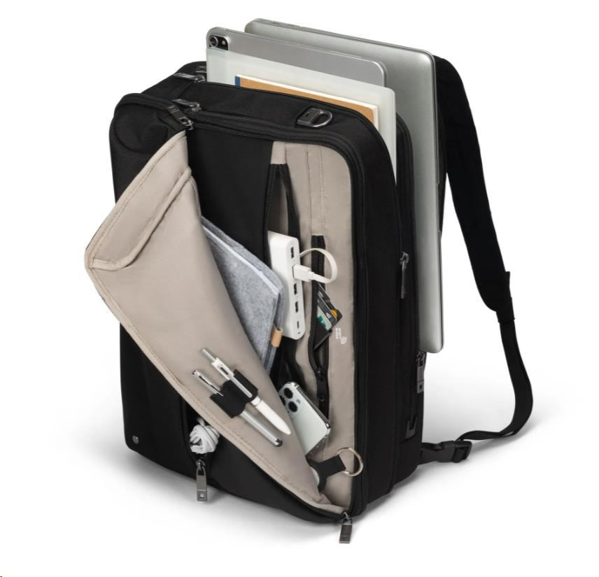 Flexibilita sa stretáva s bezpečnosťou v taške Top Traveller DUAL FIVE, konvertibilnej pracovnej taške, ktorá sa plynule premení z elegantnej aktovky na praktický batoh. Je vybavená ochranou DCT Notebook Protection a uzamykateľnou priehradkou, takže váš notebook zostane v bezpečí, zatiaľ čo skryté popruhy batohu umožňujú jednoduché prepínanie medzi rôznymi spôsobmi nosenia. Hlavná priehradka ponúka priestor pre tablety, dokumenty a mobilné vybavenie, zatiaľ čo predná časť obsahuje štruktúrované vrecká na príslušenstvo a samostatnú malú kapsu na káble a nevyhnutnosti. Navyše, s 35,5 % recyklovaných PET fľašami použitými pri výrobe, je to rozumná a ekologická voľba.