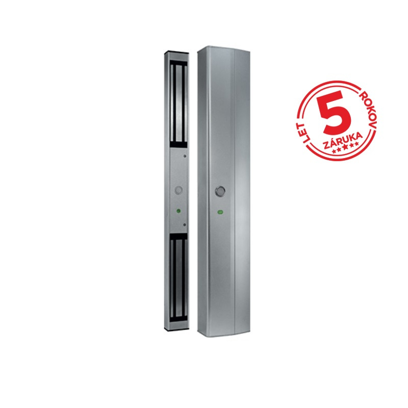 Elektromagnetická prídržná lišta, hliníkový profil na dvere s madlom, vstavané odchodové tlačidlo, montážny kus na zárubne 2x elektromagnet, prídržná sila 600 kg, rozmery 600 x 105 x 58 mm, napájanie 12–24 V DC max. 920 mA (pri 12 V DC)