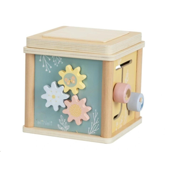Drevená activity cube (kocka) so zvieratkami si pre deti pripravila veľa aktivít, ktoré potrénujú a zdokonalia detské zručnosti. Aktivítová kocka vyrobená z masívneho dreva, preglejky a MDF ponúka veľké množstvo možností na hranie. Samotné veko (vrchná strana) drevenej kocky predstavuje zábavné bludisko v pastelových farbách, ktoré deťom s ich zatočenými drôtmi a drevenými korálkami trochu zamotá hlavu. Jedna zo strán je vkladačkou, druhá bludiskom, tretia rozkvitnutím lúky s kvetmi vo forme ozubených koliesok a štvrtá zábavnou hrou s otočnými doskami.