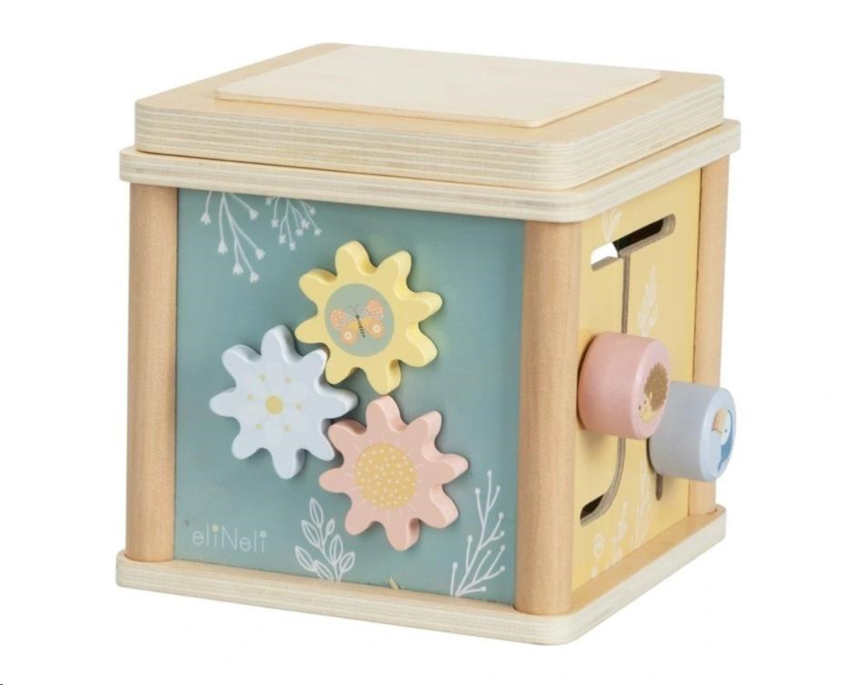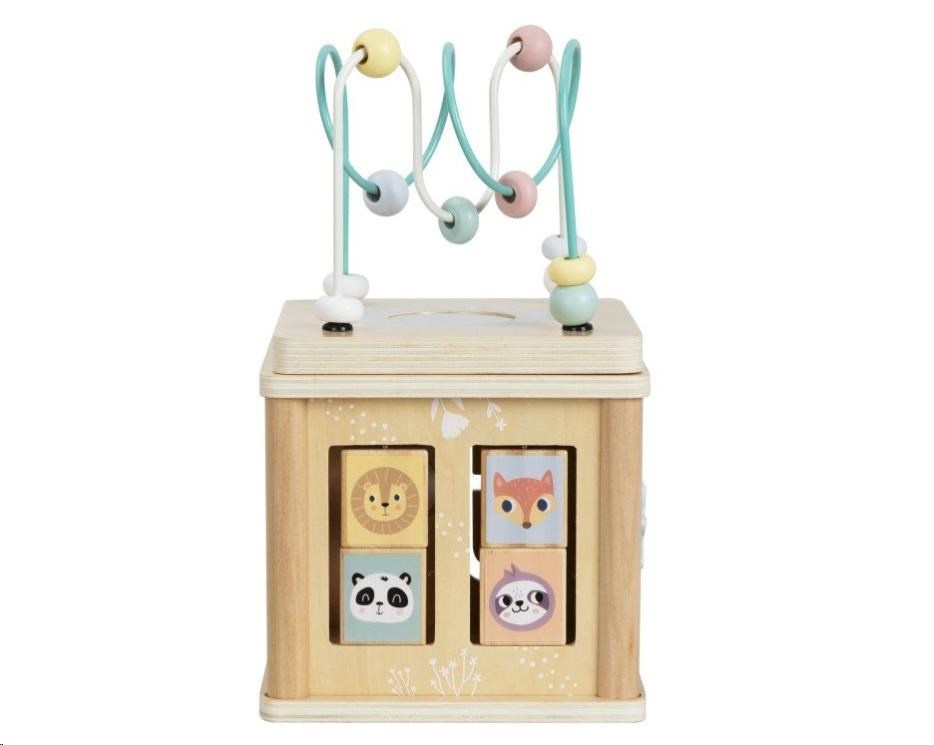 Drevená activity cube (kocka) so zvieratkami si pre deti pripravila veľa aktivít, ktoré potrénujú a zdokonalia detské zručnosti. Aktivítová kocka vyrobená z masívneho dreva, preglejky a MDF ponúka veľké množstvo možností na hranie. Samotné veko (vrchná strana) drevenej kocky predstavuje zábavné bludisko v pastelových farbách, ktoré deťom s ich zatočenými drôtmi a drevenými korálkami trochu zamotá hlavu. Jedna zo strán je vkladačkou, druhá bludiskom, tretia rozkvitnutím lúky s kvetmi vo forme ozubených koliesok a štvrtá zábavnou hrou s otočnými doskami.