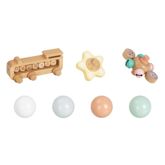 Drevená guľôčková dráha XL vyrobená z tvrdého prírodného dreva, s 6 drevenými zábavnými prvkami a s parádnym vláčikom ZDARMA je zábavnou hračkou pre dievčatká, chlapcov aj celú rodinu. Stačí správne umiestniť jeden z drevených doplnkov (guľôčku, kvietok, koliesko s rolničkami, vláčik) do horného poschodia a sledovať, čo sa bude diať. Hra s guľôčkovou dráhou zdokonaľuje motorické zručnosti, koordináciu očí a rúk, učí deti sústrediť sa a trpezlivosti, niektoré prvky stimulujú zmysly a naučia deti písmenká.