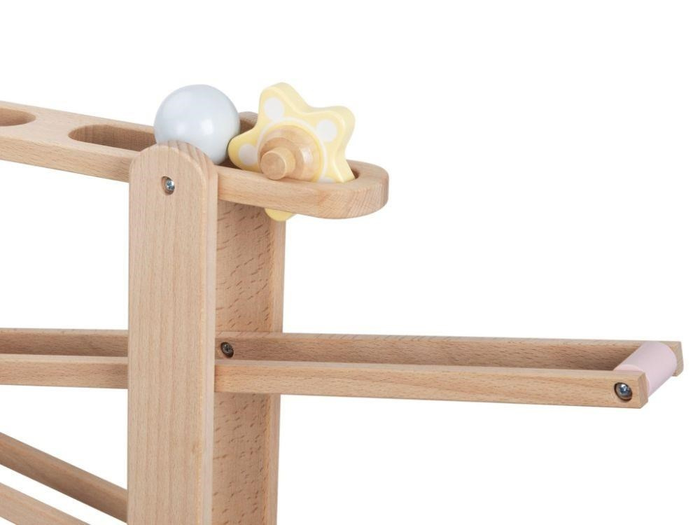 Drevená guľôčková dráha XL vyrobená z tvrdého prírodného dreva, s 6 drevenými zábavnými prvkami a s parádnym vláčikom ZDARMA je zábavnou hračkou pre dievčatká, chlapcov aj celú rodinu. Stačí správne umiestniť jeden z drevených doplnkov (guľôčku, kvietok, koliesko s rolničkami, vláčik) do horného poschodia a sledovať, čo sa bude diať. Hra s guľôčkovou dráhou zdokonaľuje motorické zručnosti, koordináciu očí a rúk, učí deti sústrediť sa a trpezlivosti, niektoré prvky stimulujú zmysly a naučia deti písmenká.