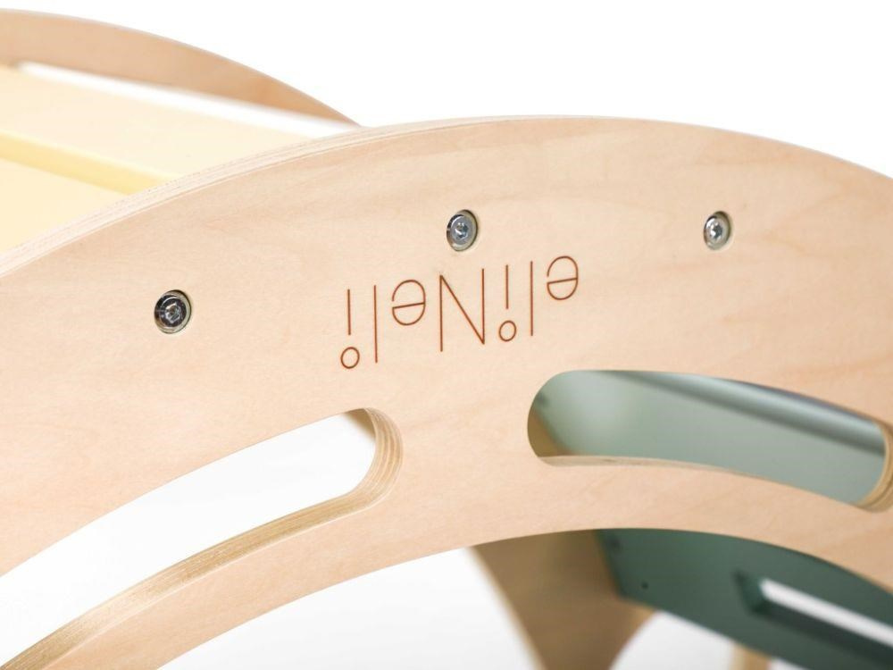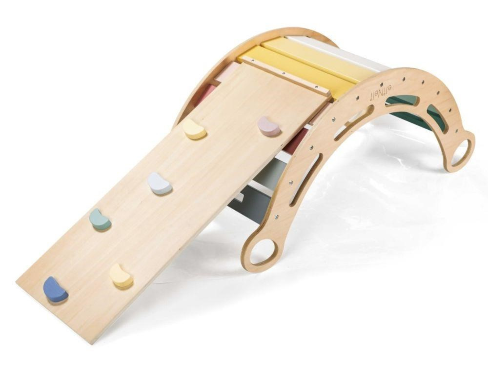 Veľká drevená Montessori hojdačka 6v1, v sete so špeciálnym obojstranným doskou a stoličkou, vám umožní vytvoriť dúhový set detského nábytku (stôl so stoličkou) takmer kdekoľvek. Rovnakou ľahkosťou tento set premeníte na malé detské ihrisko so šmýkačkou alebo lezeckou stenou. Multifunkčná Montessori hojdačka max umožní deťom príjemne sa pohupovať, môže byť lezeckou, šmýkačkou, skrýšou, mostom, s ďalšími časťami setu stolíčkom alebo detským ihriskom. Pastelový set je vhodný pre deti už od 1 roka.