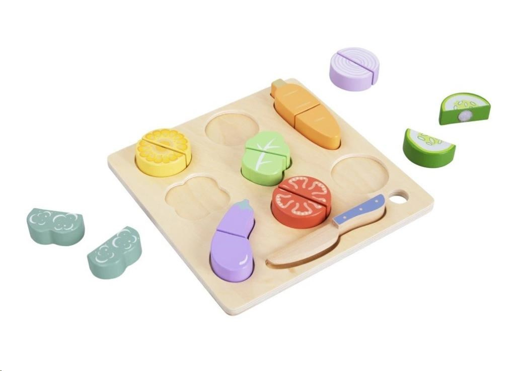 Drevená krájacia zelenina je skvelým doplnkom do detských kuchyniek aj obchodíkov. S krájacou zeleninou sa deti môžu pustiť do varenia, prípravy raňajok alebo desiaty pre svoje obľúbené hračky, kamarátov aj rodičov. Deväť druhov zeleniny, ktorú deti poznajú zo záhradky, z domova alebo z obchodu, je rozdelených na polovice, ktoré drží len suchý zips. Stačí vziať drevený nožík do ruky a na správnom mieste zeleninu rozkrojit. Súčasťou balenia je krásna krájacia doska (destička) aj drevený nôž. Krajacia zelenina je obľúbenou detskou hračkou, vďaka ktorej si deti môžu vyskúšať krájanie nožom bezpečným, detským, spôsobom.