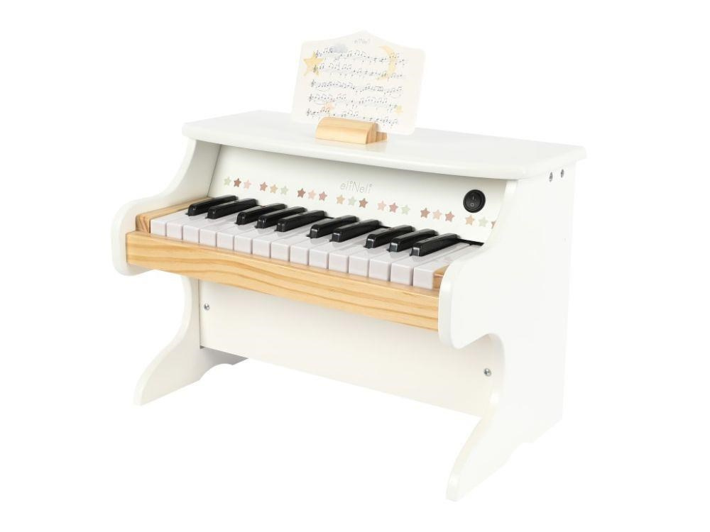 Detské drevené piano (elektrické) v kombinácii moderného bieleho odtieňa s prírodným drevom, zdobené hviezdami, premení každé dieťa na hudobnú hviezdu. Drevené detské klavíro po zapnutí vypínača a stlačení kláves vydáva krásne zvuky, zodpovedajúce skutočným tónom. Táto elektrická hudobná hračka prebúdza v deťoch lásku ku hudbe, stimuluje zmysly, rozvíja kreativitu a fantáziu.