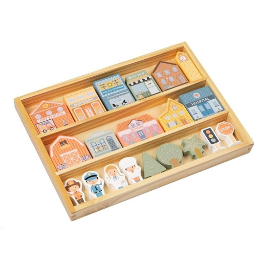 - Obsah balenia: 20 drevených kociek (domčeky, postavy, stromy a dopravné značky).