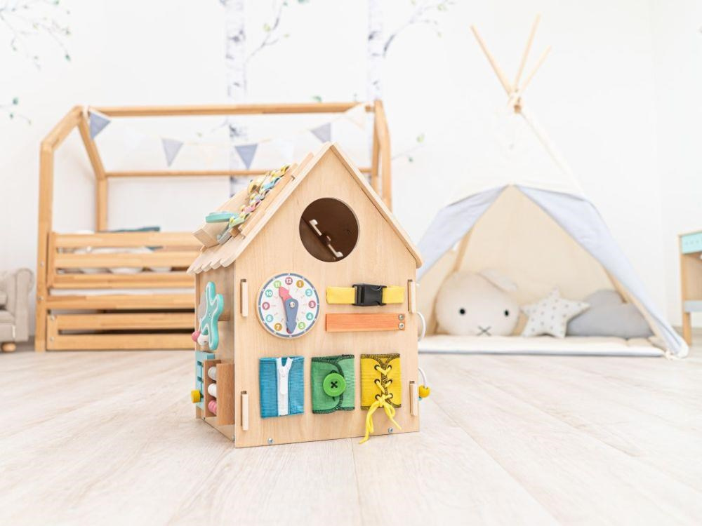 Domeček activity board v prírodnom (natur) prevedení, s montessori a hracími prvkami, s volantom a ďalšími zaujímavými doplnkami láka deti k preskúmaniu, ku hre a k učeniu sa. Drevený activity board domeček je hracou a zároveň výukovou pomôckou. Pri hre deti prirodzeným spôsobom zdokonaľujú svoje schopnosti, učia sa novým veciam a užijú si veľa zábavy.