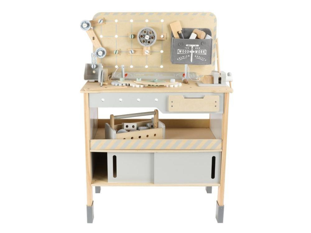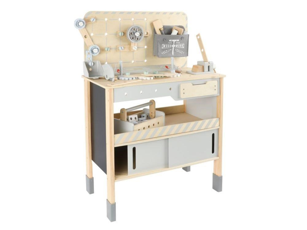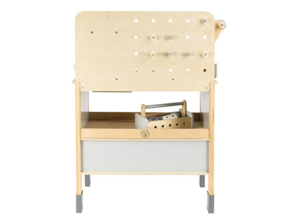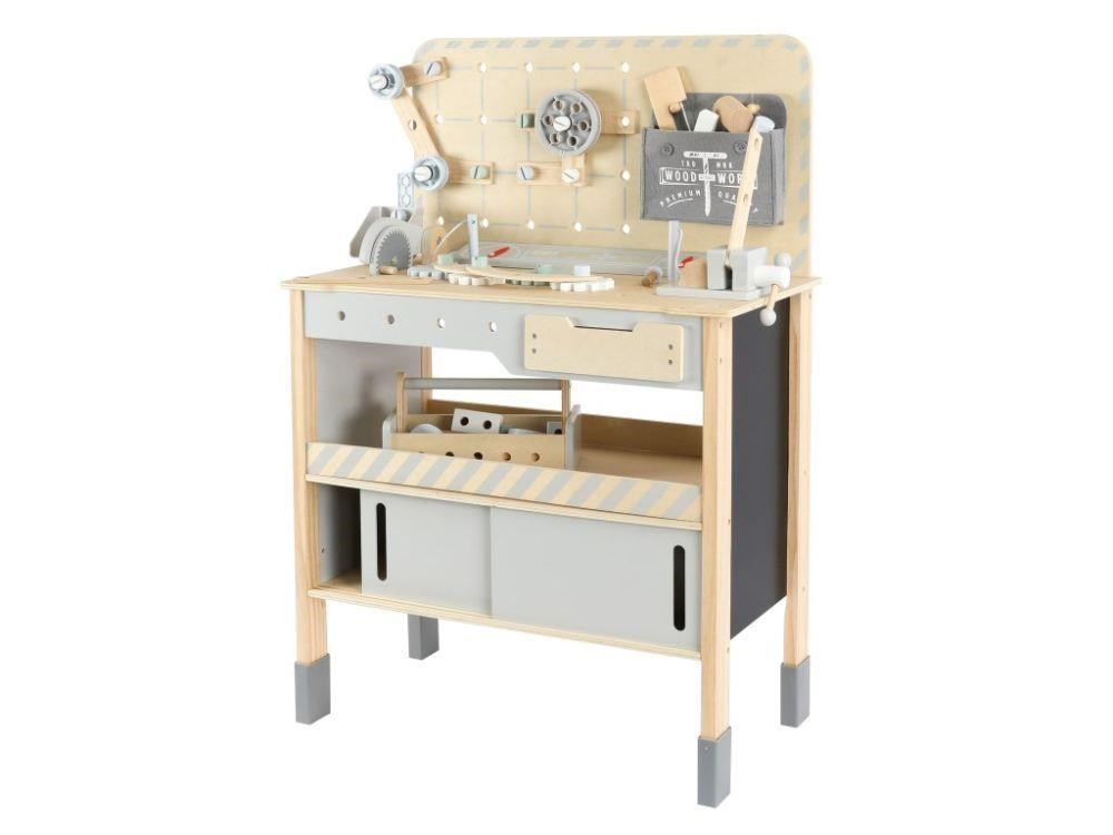 Detský drevený ponk XXL so veľa príslušenstva, skvelým jerábom a opaskom na náradie ZADARMO získa každého malého majstra. Detský ponk v kombinácii sivej farby s farbou prírodného dreva, s jerábom, náradím, skrutkami, doskami a hlavne so skvelým množstvom vychytávok rozvíja jemnú motoriku, manuálnu zručnosť, koordináciu očí a rúk, rozvíja kreativitu, učí deti sústrediť sa a trpezlivosti.