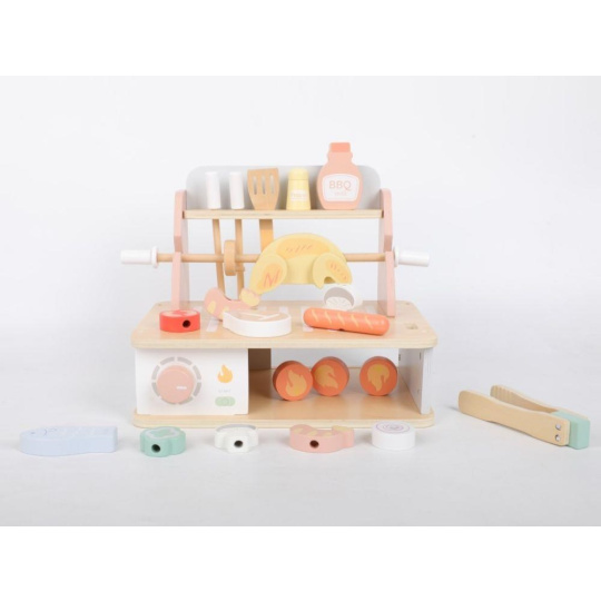 Drevený gril s bohatým príslušenstvom umožní deťom vyskúšať si grilovanie bezpečným detským spôsobom. Usporiadať Barbecue slávnosť bude hračka a veľká zábava. Žiadne letné grilovanie sa neobíde bez rôznych druhov mäsa, zeleniny a omáčok, to všetko v BBQ sade nájdete, vrátane ďalších doplnkov pre prípravu mäsa a špízu. Komponenty s detskou BBQ sadou môžete grilovať celý rok, kdekoľvek a za akéhokoľvek počasia.