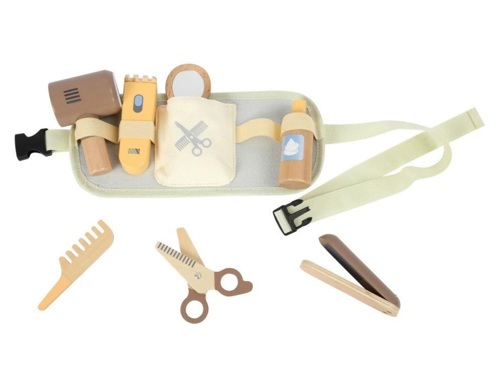 Drevená kadernícka sada, v krásnych a zároveň neutrálnych farbách, uložená v praktickom opasku, premení každé dieťa na profesionálneho kaderníka, holiča, ktorý sa s nadšením postará o dokonalý účes celej rodiny. Vďaka opasku bude všetko ľahko upratané, prenosné a vždy po ruke. Deti si svoj obľúbený kadernícky set môžu zobrať so sebou na návštevu, na víkend k babičke aj na dovolenku. Kadernícka sada zdokonaľuje detské zručnosti, manuálnu zručnosť, rozvíja predstavivosť, umožňuje deťom hrať role.