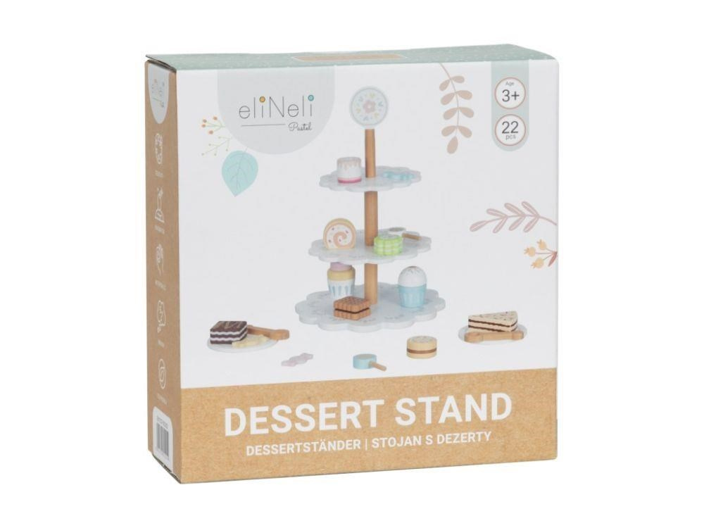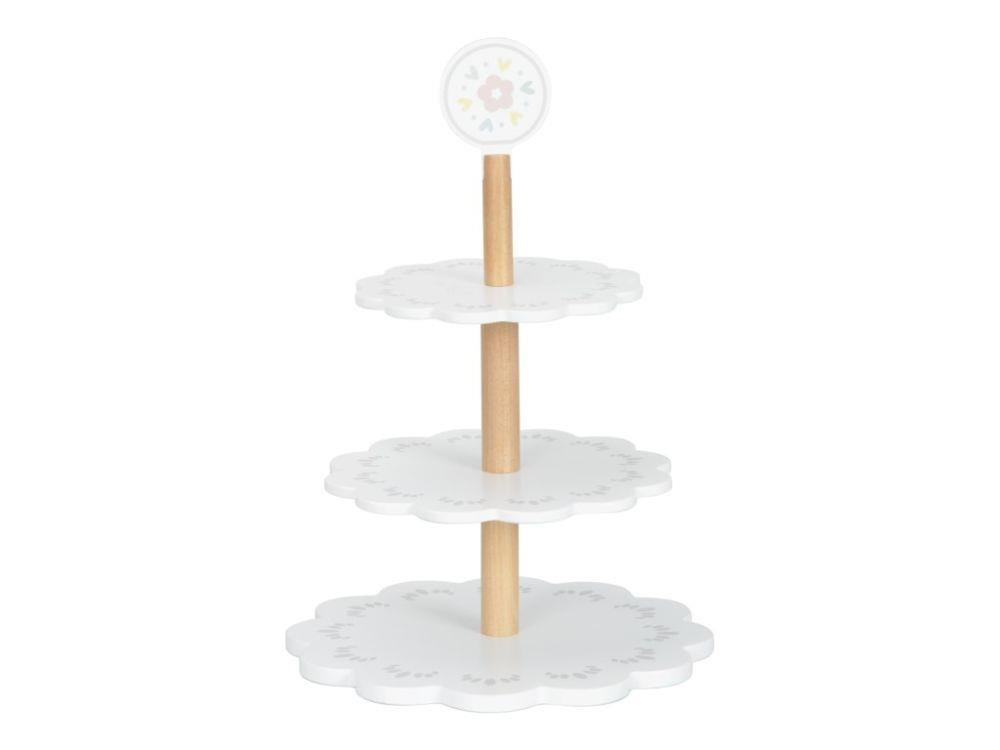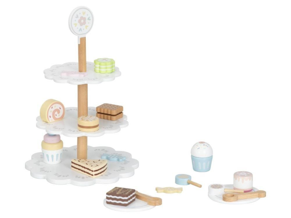 Drevený poschodový stojan s lahodne vyzerajúcimi drevenými zákuskami a cukrovinkami je ako stvorený na oslavy a čajové posedenia usporiadané pre rodičov, kamarátov aj obľúbené plyšové hračky. Drevený stojan s bohatým príslušenstvom je skvelým doplnkom do detskej kuchynky aj obchodu. Deti si môžu zahrať na cukrárov aj predavačov, rozvíjať svoju fantáziu a zdokonaľovať zručnosti.