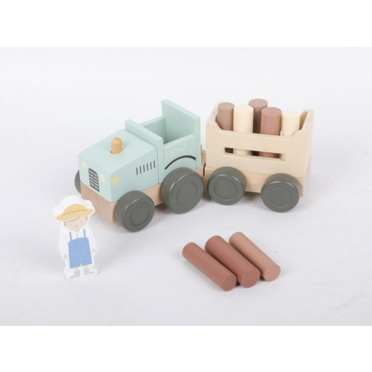 Parádny drevený traktor v jemne zelenkavej farbe, s traktoristom, ťahúňou a nákladom v podobe klátov (drevených valčekov), premení deti na skutočných farmárov. S týmto dreveným traktorom sa deti vyberú do lesa na drevo, môžu prepravovať zvieratá z farmy a akékoľvek iné hračky, kocky, čo sa im podarí naložiť na vlečku. Pri hre s traktoríkom deti hrajú role, zdokonaľujú motorické zručnosti a koordináciu očí a rúk.