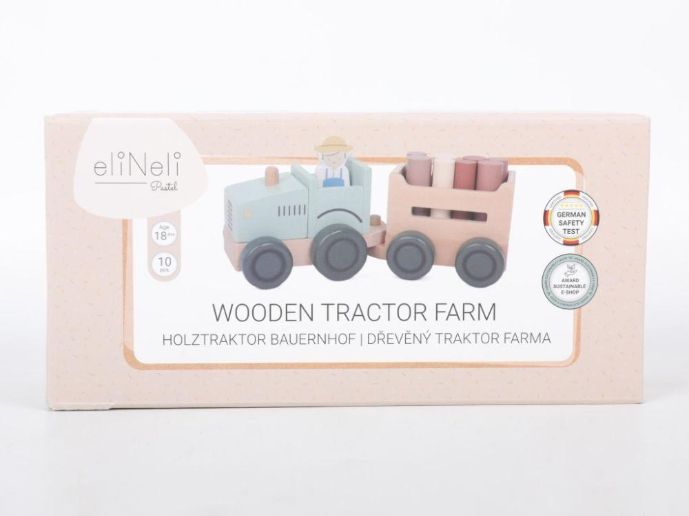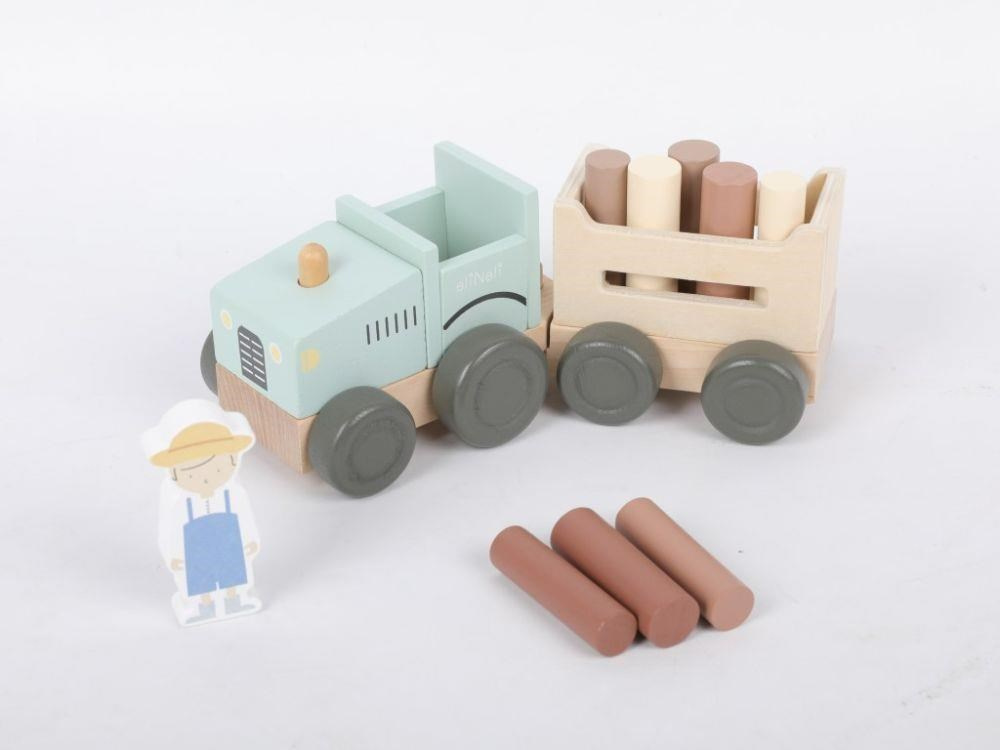Parádny drevený traktor v jemne zelenkavej farbe, s traktoristom, ťahúňou a nákladom v podobe klátov (drevených valčekov), premení deti na skutočných farmárov. S týmto dreveným traktorom sa deti vyberú do lesa na drevo, môžu prepravovať zvieratá z farmy a akékoľvek iné hračky, kocky, čo sa im podarí naložiť na vlečku. Pri hre s traktoríkom deti hrajú role, zdokonaľujú motorické zručnosti a koordináciu očí a rúk.