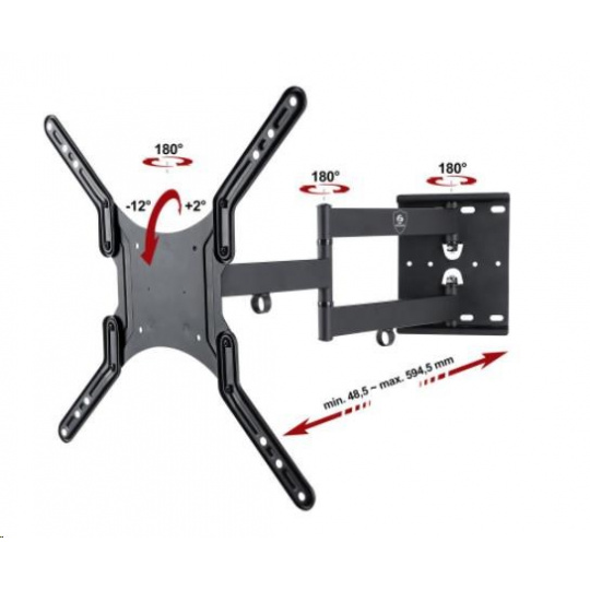 Polohovatelný držák Tv 23-55", délka až 60cm, otočný, sklopný, nosnost 45kg Nástěnný držák výborné kvality, na LCD, LED, 3D, Smart televize 23" až 55". Vynikající poměr nastavení vzdálenosti od zdi: 48mm až 595mm. Robustní odolná konstrukce držáku zvládne zavěšení televizorů s hmotností až 45kg. Televizor lze po zavěšení na držák otáčet na obě strany, naklápět, odsouvat a přisouvat ke zdi, korigovat rovinu Tv. Na ramenech jsou úchytky na kabeláž. Nástěnný úchyt poskytuje mnoho možností instalace na stěnu. Držák je dodáván v černém provedení, v balení naleznete instalační materiál a přehledný návod v CZ. Záruka 3 roky. Držák ErgoSolid Telfor - skvělá kvalita a vynikající poměr nastavení vzdálenosti od zdi 48mm až 595mm, nosnost 45kg Technické údaje: nosnost 45kg podpora VESA standardu pro zavěšení Tv a monitorů 100x100 až 400x400 doporučujeme na televizory a monitory s úhlopříčkou 23" až 55" nastavení vzdálenosti od zdi 48mm až 595mm nastavení náklonu v rozmezí +2° až -12° otáčení na obě strany až +/- 90° korekce roviny obrazovky +2° až -2° velmi pevná, robustní konstrukce úchytky na kabeláž instalační materiál barevné provedení černé záruka 3 roky Držák ErgoSolid Telfor podporuje VESA standardy pro zavěšení Tv 23-55": VESA 100x100 VESA 200x100 VESA 200x200 VESA 200x300 VESA 200x400 VESA 300x200 VESA 300x300 VESA 400x200 VESA 400x400 držák nepodporuje VESA 75x75 a 400x300.