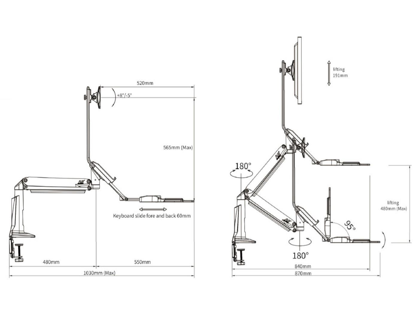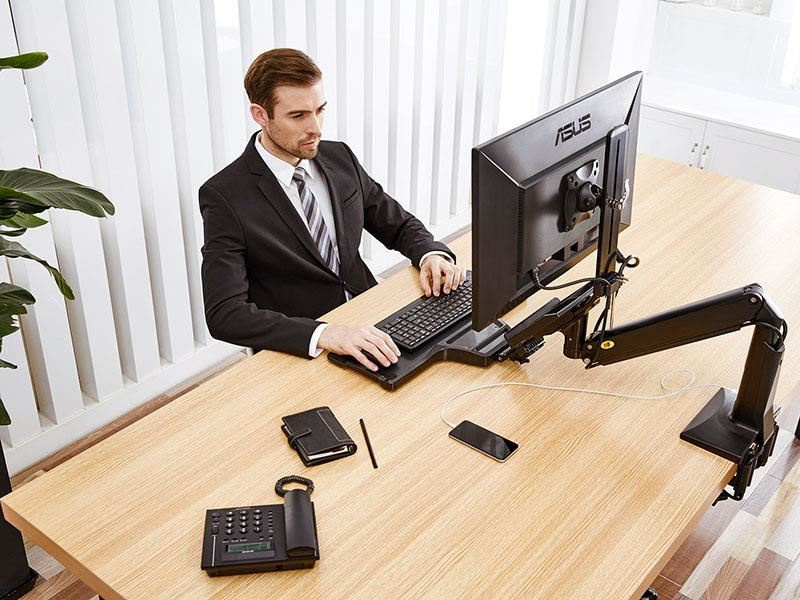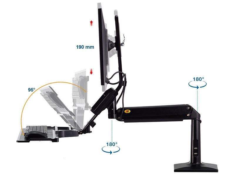 Držiak monitoru a klávesnice NB NB35 Profesionálny stolný držiak na monitor 17-30" s poličkou na klávesnicu 560x200mm, výškovo nastaviteľný +/-480mm, naklápanie +12°/-15°, otáčanie +/-180°, pivot, možnosť vysunutia a zaklopenia police, priehradka, 2x USB 3.0 porty, práca v sede aj v stoji, VESA 75x75 a 100x100, nosnosť 9kg Univerzálny stolný držiak na monitor 17-30" a klávesnicu pre ergonomické kancelárie, ktorý Vám umožní kedykoľvek zmeniť pozíciu pre prácu ako v sede, tak aj v stoji. Zmena polohy je veľmi ľahká a rýchla, bez použitia akýchkoľvek nástrojov alebo zložitých nastavovaní - počas okamihu zmeníte výšku až o 480mm. Na držiak je možné uchytiť všetky typy monitorov s VESA štandardom 75x75 alebo 100x100. Držiak umožňuje ľahké kompletné nastavenie podľa potreby - otáčanie do strán, výškovo nastaviteľnosť, náklon obrazovky, posun a náklon police, vzdialenosť od stolového uchytenia, korekcia roviny. Kvalitný duálny úchyt na zabezpečenie na okraji stolu a perfektná fixácia. Profesionálna kvalita, vynikajúce spracovanie, pekný dizajn a veľmi jednoduché nastavenie. Farebné prevedenie čierne. Profesionálny polohovateľný držiak monitora a klávesnice na prácu v sede aj v stoji NB NB35 Technické údaje: maximálne zaťaženie 9kg minimálne zaťaženie 2kg podporuje VESA štandardy 75x75 a 100x100 možnosť rozšírenia VESA štandardu na 200x100 alebo 200x200 ideálny na monitory a televízory s uhlopriečkou 17-30" otáčanie do strán +/- 180° náklon monitoru -12° / +15° funkcia pivot - možnosť polohy monitora na šírku alebo na výšku maximálna výška 950mm od stolovej dosky maximálna dĺžka od uchytenia 1020mm celkové výškové nastavenie +/- 480mm úprava výšky samotného monitora na držiaku 100mm polica na klávesnicu s rozmermi 560x200mm možnosť vysunutia police +/- 60mm, naklopenie +/- 12°, možnosť úplného zaklopenia uchytenie na okraj stola, duálny úchyt, na dosky o hrúbke 20-90mm 2x USB 3.0 port farebné prevedenie čierne profesionálna kvalita, jednoduchá polohovateľnosť záruka 3 roky Pracovná stanica - polohovateľný držiak na monitor a klávesnicu pre voľbu, či chcete pracovať v sede alebo v stoji NB NB35. Polohovateľný držiak na monitor aj klávesnicu, výškové nastavenie pre možnosť práce v sede alebo v stoji, jednoduché a rýchle polohovanie - Fiber Mounts NB35 Držiak podporuje VESA štandardy: VESA 75x75 VESA 100x100