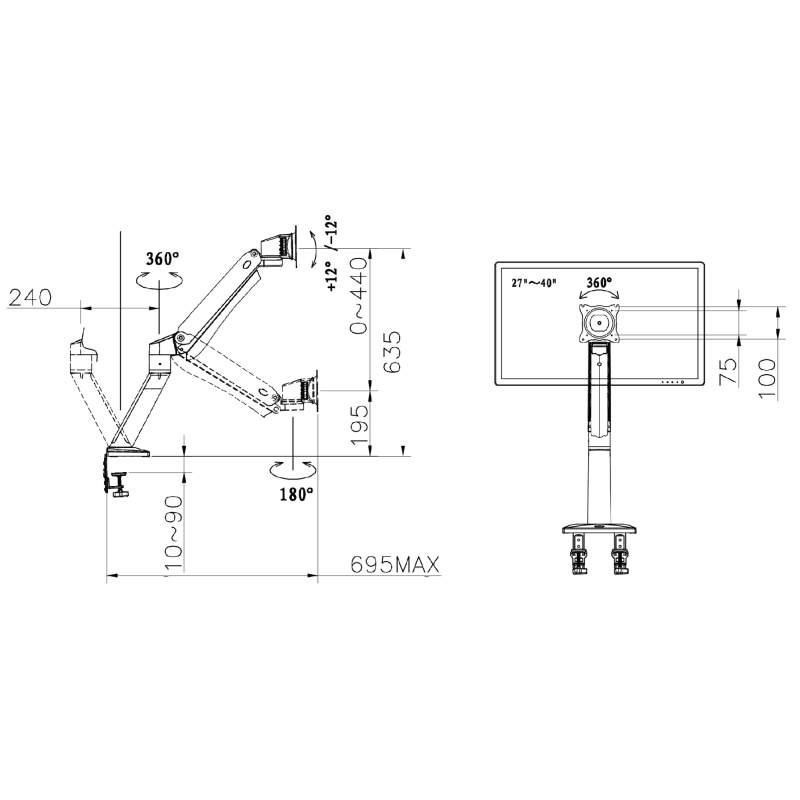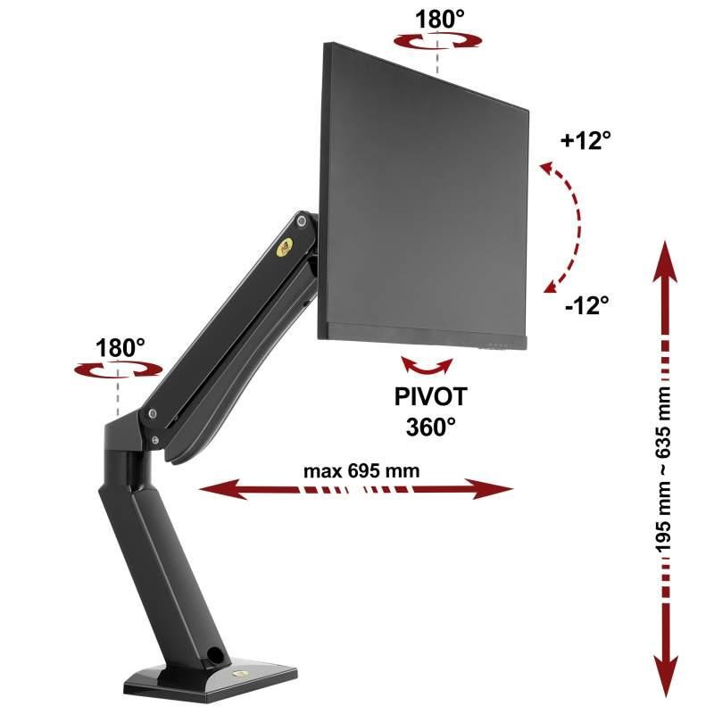 Stolný polohovateľný držiak na monitor alebo TV NB NB45B Stolný držiak na monitor alebo TV 27-43", otočný +/-180°, sklopný +/-12°, nastavenie výšky 195-635mm, dĺžka podľa otočenia 0-695mm, pivot, vedenie káblov, 2 typy stolových uchytov, VESA 75x75 a 100x100, nosnosť 15kg Profesionálny stolný držiak na veľké monitory s uhlopriečkami 27" až 43". Držiak je plne polohovateľný v 3D - otáčanie do strán, naklápenie, výškové polohovanie, rotácia monitoru, vzdialenosť od stolového uchytenia. Rameno držiaka má integrovaný plynový piest, ktorý ľahko nastavíte na hmotnosť zaveseného monitoru, potom už môžete monitor ľubovoľne výškovo polohovať veľmi ľahko a rýchlo bez náradia, iba jednou rukou. Držiak je špičkovej kvality, je vhodný aj do prevádzok, kde je nutné neustále nastavovanie polohy monitoru. Rameno držiaka má integrované krytky pre skryté vedenie káblov. Uchytenie na stolovú dosku (akékoľvek vodorovné dosky) o priemere 10mm až 90mm. Uchytenie je možné buď na okraj dosky (2 svorky) alebo kamkoľvek do priestoru (potrebná 1 dierka o priemere 10-50mm). Farebné prevedenie čierne. Záruka 3 roky. Profesionálny stolný držiak na monitor alebo TV NB NB45B Technické údaje: nosnosť (nastaviteľné zaťaženie) 3kg až 15kg na monitory a televízory s uhlopriečkou 27" až 43" VESA štandardy 75x75 a 100x100 (možnosť rozšírenia) 3D nastavenie polohy otáčanie do strán +/- 180° vzdialenosť max. 695mm od uchytenia výška 195mm až 635mm náklon +/- 12° rotácia obrazovky (PIVOT) - otočenie do vodorovnej alebo zvislej polohy najvyššia kvalita spracovania systém na vedenie káblov 2 typy uchytenia na stolové (vodorovné) dosky - na okraj alebo do priestoru na stolové dosky 10mm až 90mm farebné prevedenie čierne záruka 3 roky Stolný držiak na monitor NB NB45B Držiak monitoru TV NB45B podporuje VESA štandardy: VESA 75x75 VESA 100x100