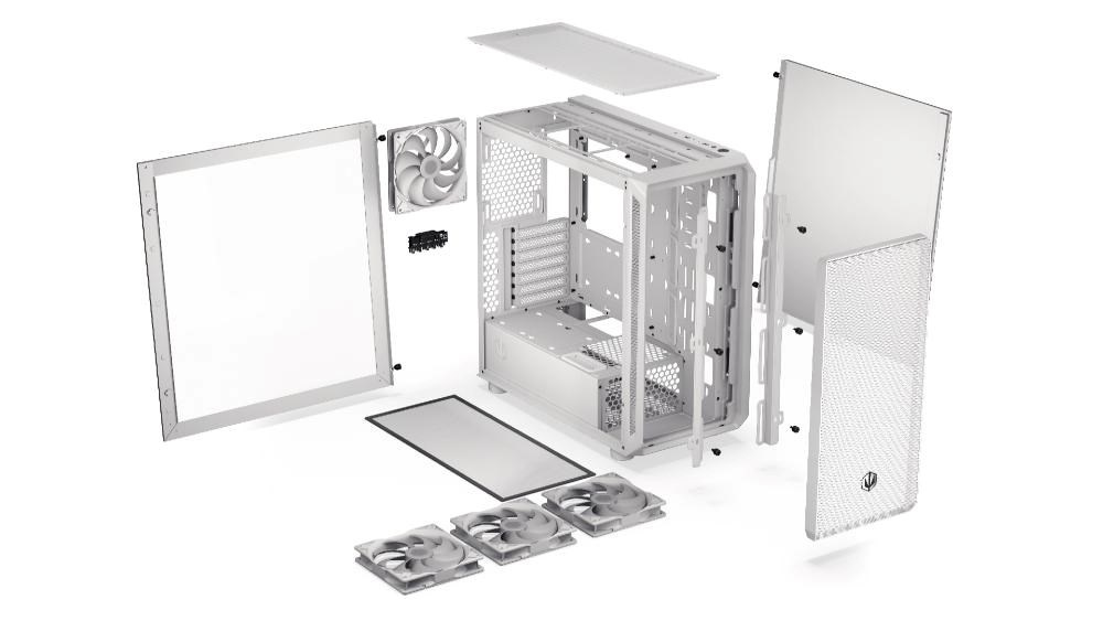 Arx 700 White ARGB je biele šasi kompatibilné so základnými doskami ATX a menšími doskami. Skriňa je určená pre špičkové komponenty, podporuje chladiče o priemere až 360 mm a pojme až 8 ventilátorov – vrátane 4 predinštalovaných jednotiek Stratus 140 White PWM ARGB, ktoré zabezpečujú tichý chod a výkonné prúdenie vzduchu.