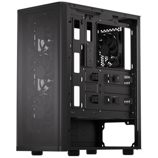 Skriňa formátu Middle Tower s priehľadnou bočnicou z tvrdeného skla ponúka dve 2,5" pozície pre SSD disky a jednu 3,5" pozíciu pre pevný disk. Na hornej časti sa nachádza dva USB 3.0 porty, výstup na slúchadlá a audio vstup pre mikrofón. Vybavená je štyrmi 120 mm ventilátormi, ktoré spolu s perforovaným čelným panelom zabezpečujú dostatočný prúd vzduchu. Dômyselné riešenie umožňuje pohodlné umiestnenie až 360 mm dlhého výmeníka vodného chladenia na prednej strane. Vo skrini je dostatok priestoru pre chladič CPU do výšky až 161 mm a grafickú kartu dĺžky až 315 mm. Dodávaná je bez zdroja. Súčasťou je tiež sada prachových filtrov.