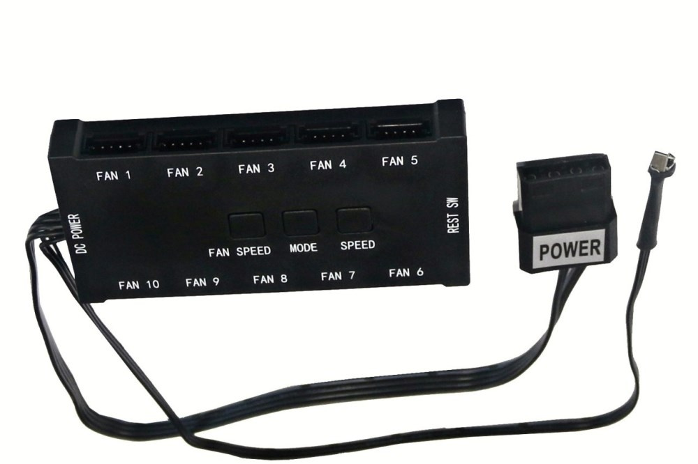- riadiaca jednotka umožňuje pripojenie až 10ks ventilátorov a ovládanie tlačidlom priamo na jednotke, napájanie jednotky cez konektor "molex" z PC zdroja