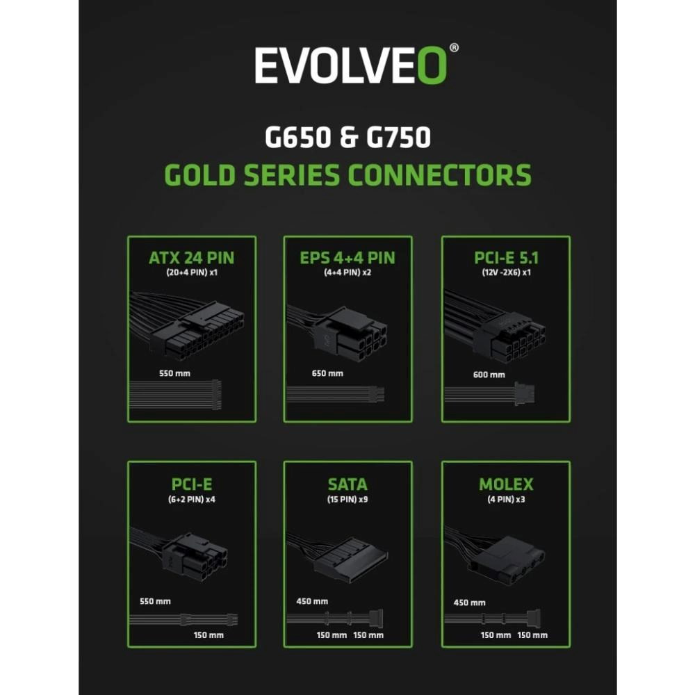 EVOLVEO G650 zdroj 650W, 80+ GOLD, ATX 3.1, aPFC, 140 mm ventilátor, záruka 3 roky, bílý