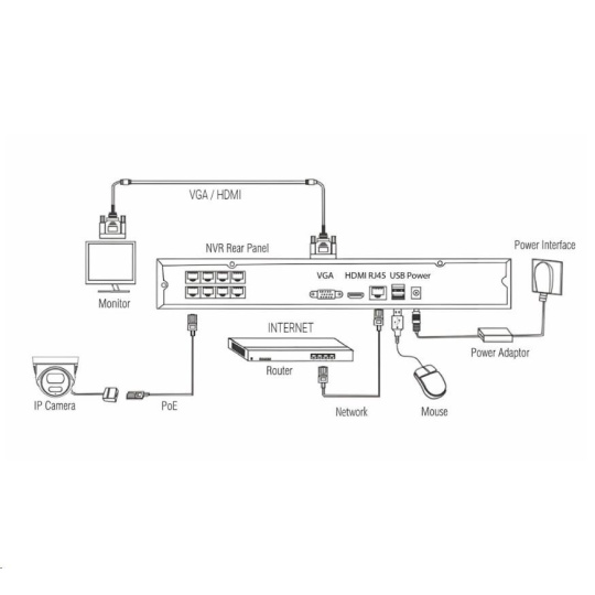 | Obsah balenia | NVR jednotka s 8x LAN/POE vstupom, SATA pripojením pre až 8TB disk 4x POE Bullet IP66 kamera s nočným prísvitom 1x napájací adaptér DC 48V 2A 4x sada na upevnenie kamery 4x bajonetová tesniaca krytka pre RJ45 konektor 1x USB myš 1x SATA kábel pre pripojenie HDD 1x Užívateľský manuál |