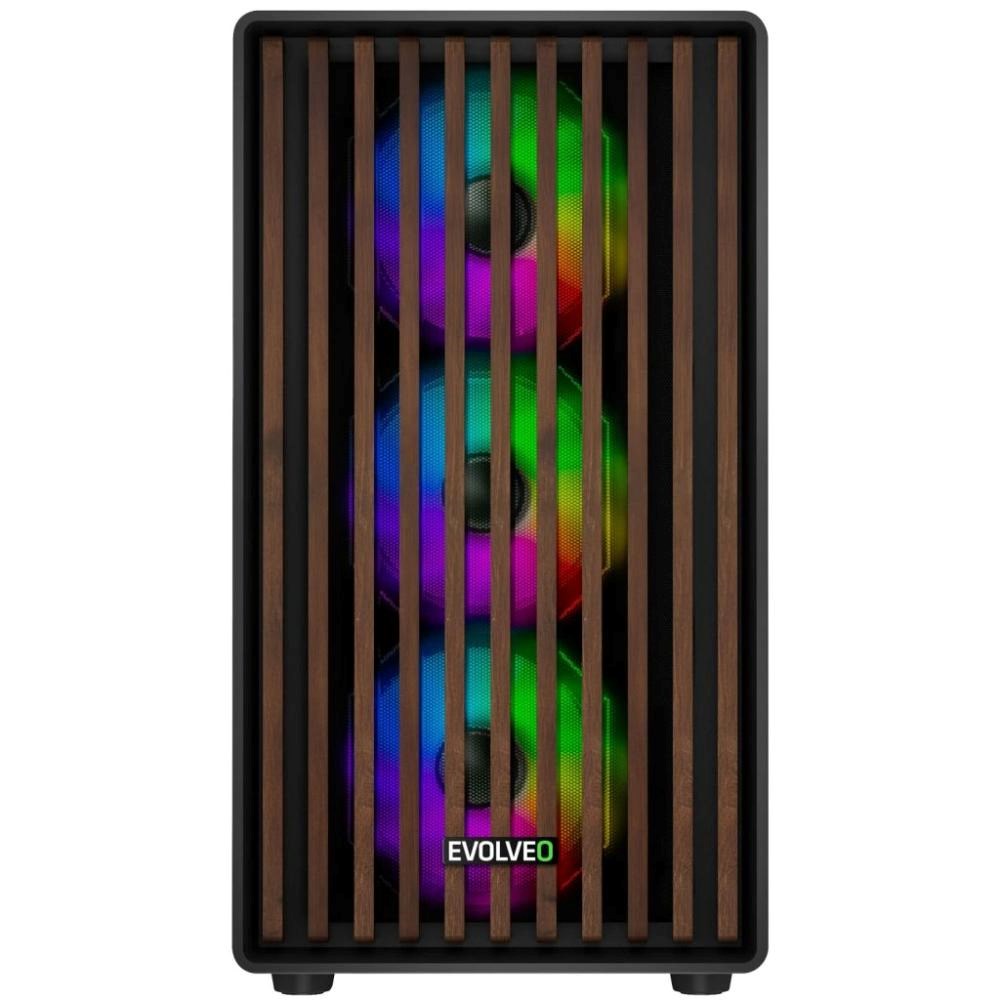 EVOLVEO Panthera, skříň mATX, 6x ARGB ventilátor 120mm, dřevěný přední panel + skleněná bočnice