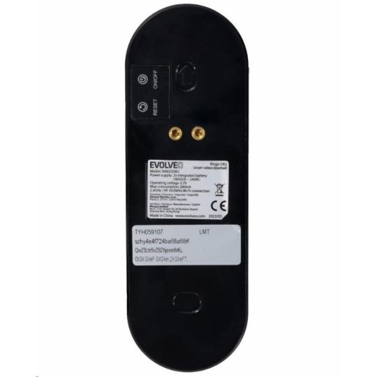 | Obsah balenia | EVOLVEO Ringo DB2, chytrý videozvonoček Zvonček do zásuvky Používateľský návod Plochá montážna konzola Uhlová montážna konzola 3M samolepiaca montážna nálepka Nabíjací káb?l USB Malý imbusový kľúč Bezpečnostný skrutka 2x montážne skrutky + hmoždinky 2x montážne skrutky pre uhlovú konzolu 2x pripojovacie vodiče pre pevnú kabeláž 2x skrutky na pripojenie vodičov |