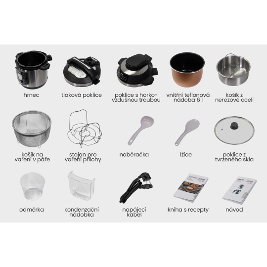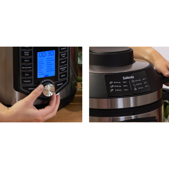 Ovládací panel hrnca aj horkovzdušnej rúry sú v českom jazyku a sú jednoduché a intuitívne. Okrem preddefinovaných programov je možné použiť vlastné nastavenie pre tlak a čas prípravy jedla. U horkovzdušnej rúry je možné nastaviť aj teplotu.